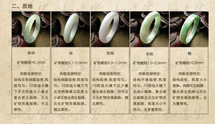 二、翡翠的基本概念1.翡翠知识1.1 种(共4级) 种指的是翡翠的质地,也是对一件翡翠产品的最基本的描述,在市场上的所讲的老种、新种、玻璃种、冰种、蛋清种、豆种、油青种、蓝花、蓝水、晴水等等都是习惯上的商业名称,但是由于这些商业名称在标准上并没有一个明确的定义,所以并不能把它作为我们的分级标准。事实上,翡翠的结晶体颗粒大小和这些颗粒的交结关系是决定翡翠商业品种的主要原因,并由此制定出以下分级标准: