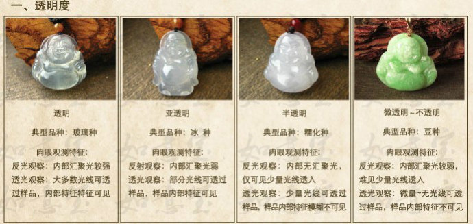 级别形状做工重量1级比例适合,饱满大方名师制作、巧夺天工5克拉以上2级比例适合,饱满大方自然流畅、匠心独具5克拉以上3级比例适合,饱满大方普通制作、平整光滑5克拉以上4级比例适合制作一般无要求2.关于种和色的资料硬玉的分级: 传统老式的玉石分级总是以深色老坑,老坑,金丝种,新坑种,油青种,豆青种来形容,但是对消费者来说,可以说是太过于抽象,为了让消费者能够简单且贴切了解玉石,以下提供新的分级法做参考。2.1 质地(种)(1)玻璃地:质地明亮、清澈、细腻。最重要的是具有类似宝石单一结晶体之"硬"的感觉,极少可见之石纹,若有可见之杂质则多为形冻石花、甘蔗渣或片状之黑烟。此种质地镶起后常可见内部之反射光芒,有时会有"猫眼"现象。这个质地是所有种质中的最高等级,可谓千万年不变。(2)冰地:顾名思义,其结晶如冰块或冰糖感觉,干净度颇高。质地亦颇细致,但其感觉不如玻璃地来的冻、硬,这种质地镶起后水头相当好。(3)化地:其质地正如"果冻"之半透明状,但可见细微小石花、棉絮等。(4)冬瓜地:质地亦接近半透明状,感觉如煮熟后之冬瓜。(5)糯米地:质地要透不透,具有如熟糯米之细腻感,一般所称之芙蓉地与此质地接近。(6)翻生地:质地类似糯米地,但玉肉中部份结晶如不熟之生米般出现饭渣。(7)豆地:如豆般不太通透,透度只入表面二分,有非常多可见之棉柳,苍蝇翅、稀饭渣等,此种质地在强光下照射一段时日后易起小白花,"娇度"降低。(8)白地:一般玉石结晶多呈白色与无色,白色又为最常见之色彩,前述之新厂玉多只到此级,此质地己无通透之意境可言,此质地与常称之"瓷地"接近。(9)芋头地:白中略带灰,色如芋头般,底属木。(10)灰地:不透明,质地多纤维,色暗如香灰般,具沙性。(11)乌地:质地呈黑褐色,不透明,底木。(12)油地:种质冰、硬,感觉有油脂光泽浮于表面。一般颜色较墨绿之玉石较有机会出现上现象。