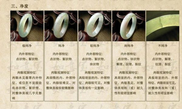1.3 底(共4级) 底指的是翡翠絮状物(又称棉),黑斑,其它色斑的多少程度。由于翡翠是多种矿物的集合体,其结构多为纤维状结构和粒状结构,杂质的多少程度也必然影响翡翠的价值。