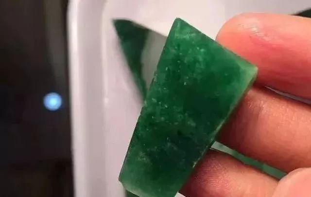 在打光灯下看抠下的好料,通透底子很干净,绿的有些辣眼。切的过程中,片料被分成了大大小小,打型、磨边,料子越切越小,戒面越磨越多,有种有色,非常不错。