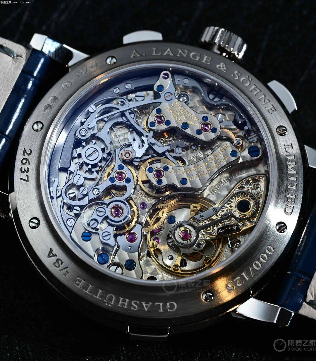 ▲盘面细节 这只蓝盘DATO,使用的是,标准版本的L951手动计时机芯,以及朗格标准的装饰方式。德国银夹板,上层夹板有格拉苏蒂条纹装饰,下层夹板是珍珠纹装饰,计时部件的杠杆以拉丝为主。