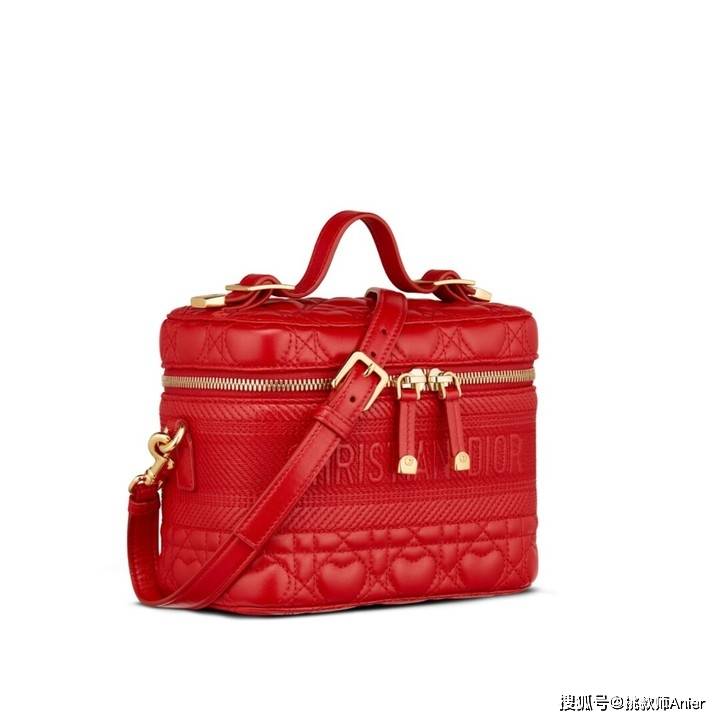 以往运用棉麻面料打造的化妆箱包,在DiorAmourt系列换上细致的小羊皮革回归,一改经典藤格纹绗缝压纹,布满包身的爱心造型图案,搭配鲜艳的正红色系,绝对是全场唯一的目光焦点。