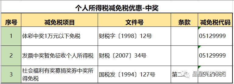 个人所得税 减免税项目总结 截止2019年7月,根据总局的减免税代码表统计,现行有效的个人所得税减免项目有57项,将其分为了14类,分类如下: 第一类,与房屋相关的优惠,一共有8项。 第二类,与金融保险相关的优惠,一共有11项。 第三类,与农业相关的优惠,一共有2项。 第四类,与弱势群体相关的优惠,一共有3项。 第五类,与受灾人员相关的优惠,一共有2项。 第六类,与军转相关的优惠,一共有3项。 第七类,与普通工薪相关的优惠,一共有2项。 第八类,与特定职业相关的优惠,一共有2项,分别是远洋运输人员和外交人员。又一次看到了外交人员,不总结还没注意到外交人员优惠这么多。 第九类,与外籍个人相关的优惠,一共有7项。 第十类,与专家人才相关的优惠,一共有5项。 第十一类,与中奖相关的优惠,一共有3项。 第十二类,与鼓励行为相关的优惠,一共有2项,分别是见义勇为奖金和举报违法犯罪奖金免税。 第十三类,与地区相关的优惠,一共有2项。 第十四类,与税收协定相关的优惠,一共有5项。 上述优惠具体的政策文号如下: