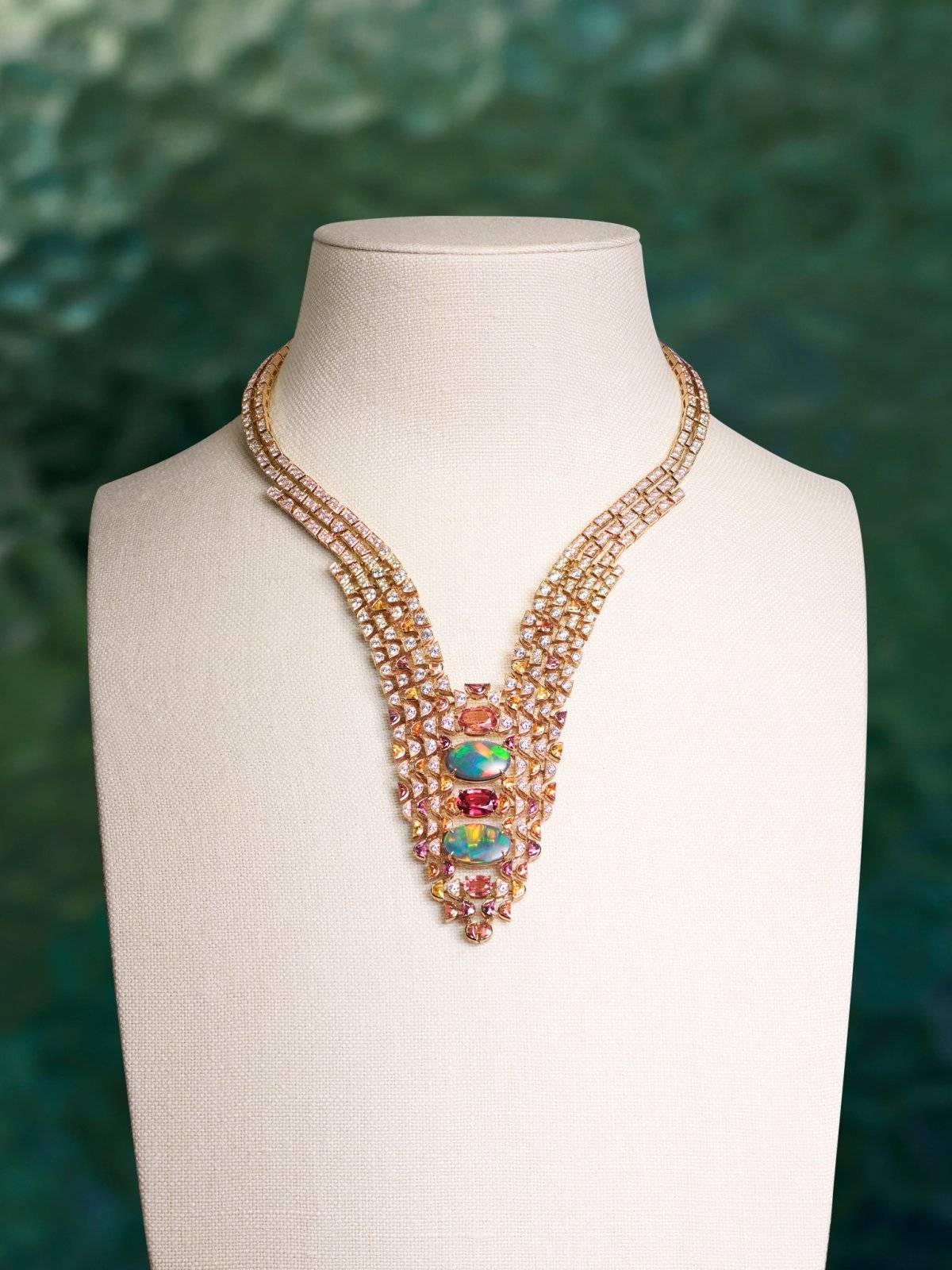 而全新高级珠宝系列的“DIVITA项链”则巧妙混搭翡翠圆珠、尖晶石、碧玺、欧泊与钻石等不同材质,通过几何图案与考究的镂空设计,呈现丰饶华美而又巧妙平衡的效果。柔和细腻、近乎植物般的色调与有机形态的宝石形成呼应。
